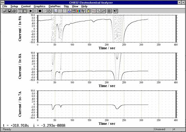 当 仪 器 用 于 流 动 电 解 池 电 化 学 检 测 时 三 个 量 程 数 据 实 时 显 示