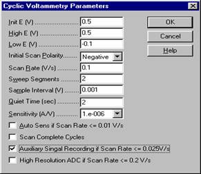 · 模 拟 参 数 : 标 准 氧 化 还 原 电 位 , 电 子 转 移 速 度 常 数 , 传 递 系 数 , 浓 度 , 扩 散 系 数 , 正 反 向 化 学 反 应 速 度 常 数 , 温 度 , 电 极 面 积 , 双 电 层 电 容 , 及 实 验 参 数