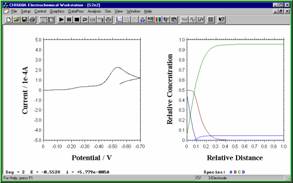 数 字 模 拟 器 在 模 拟 过 程 中 同 时 显 示 伏 安 响 应 和 各 种 物 质 的 浓 度 剖 面 图 |